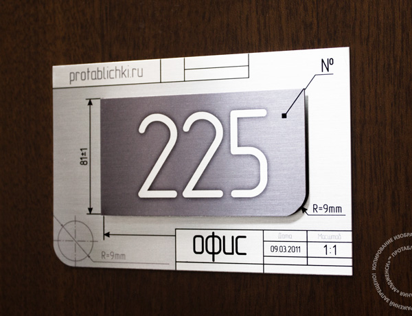 Табличка индивидуальной формы в фирменном стиле Вашей компании. Двойная конструкция, создающая объем. Представленный образец размером 12х8 см, верхняя табличка с номером 8х4,5 см.